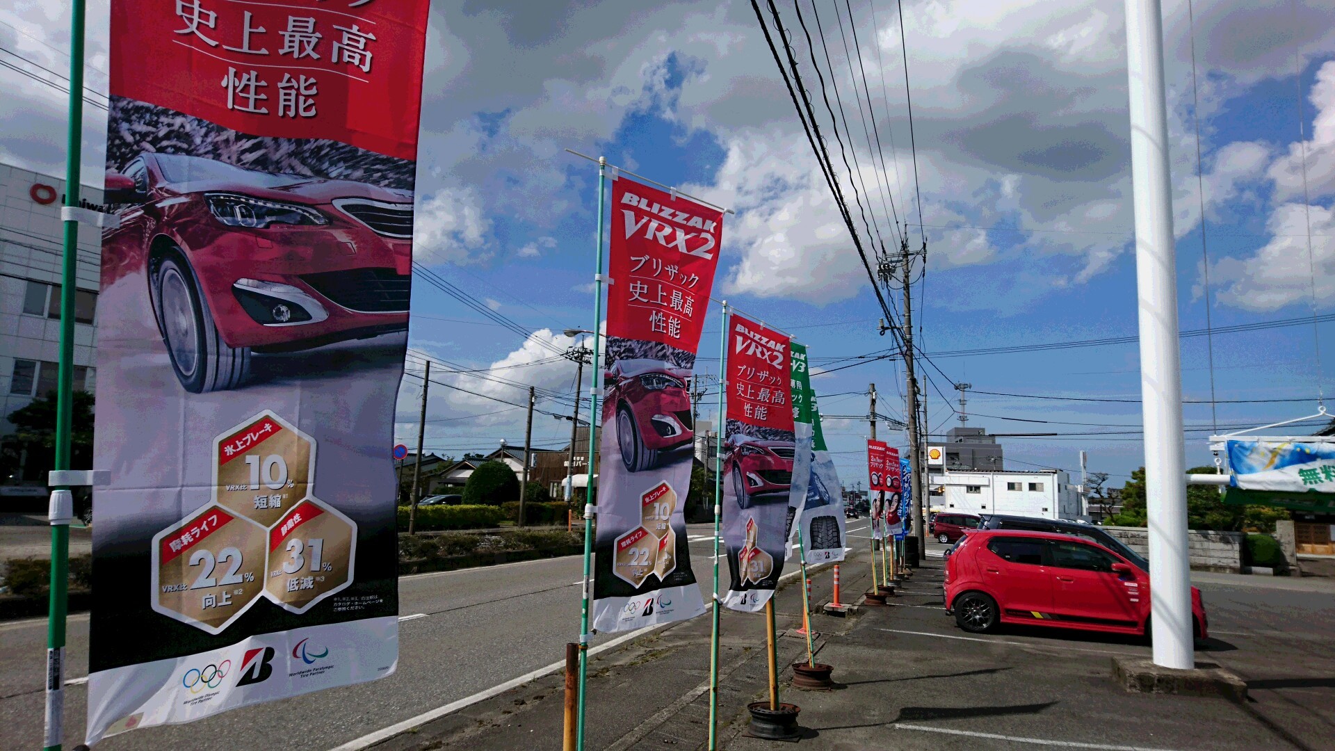 タイヤ館福井インターの幸光です。スタッドレスシーズンに向けて、お店ののぼり旗を冬用にチェンジ