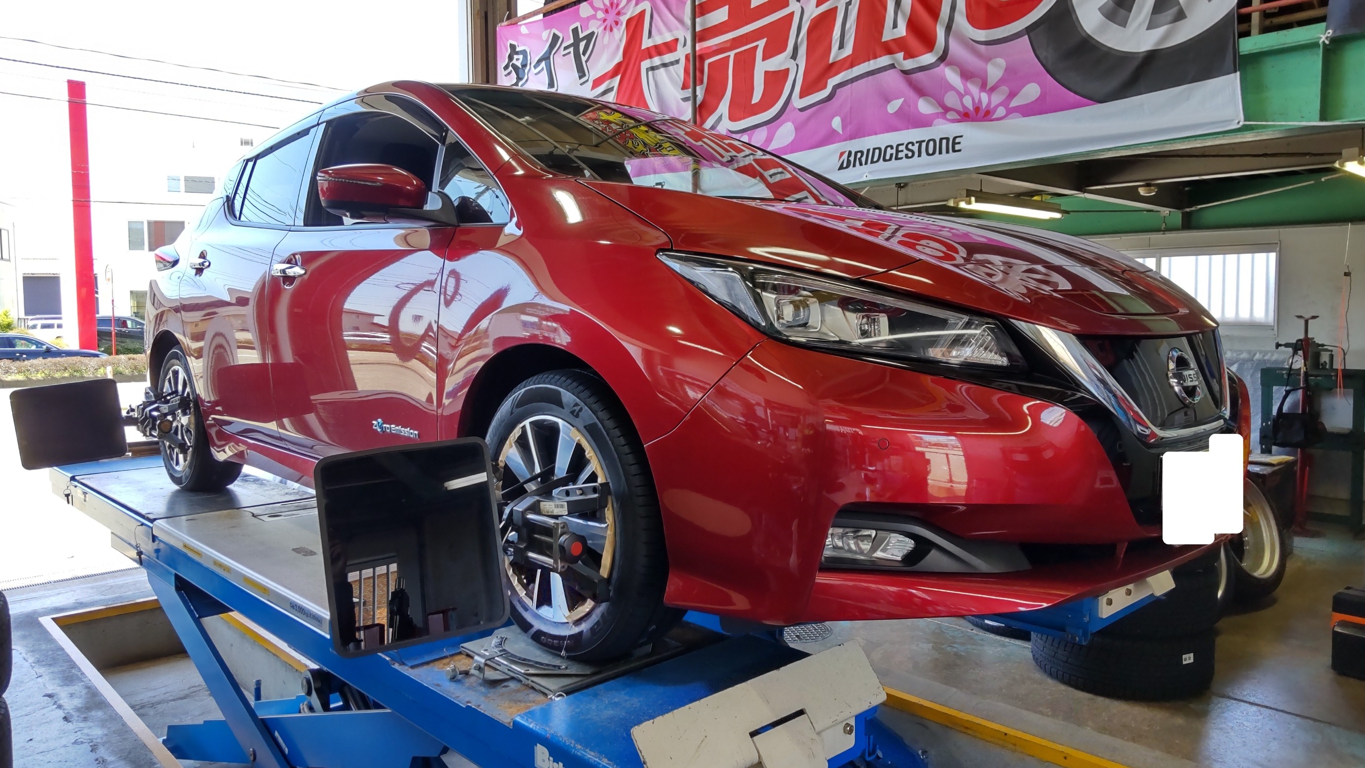 こんにちは。タイヤ館福井インターの幸光です。日産リーフのアライメント作業です。