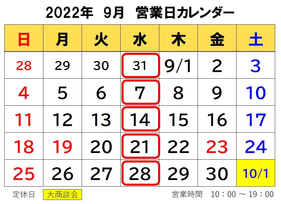 9月の営業日は左記の通りとなります。