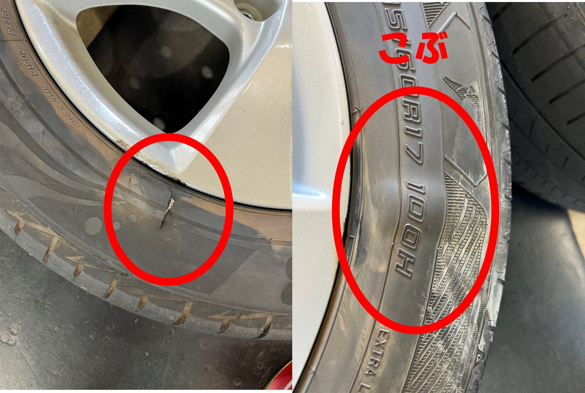 縁石に乗り上げてしまったお客様・・・右前のタイヤは、完全に破てしまい
