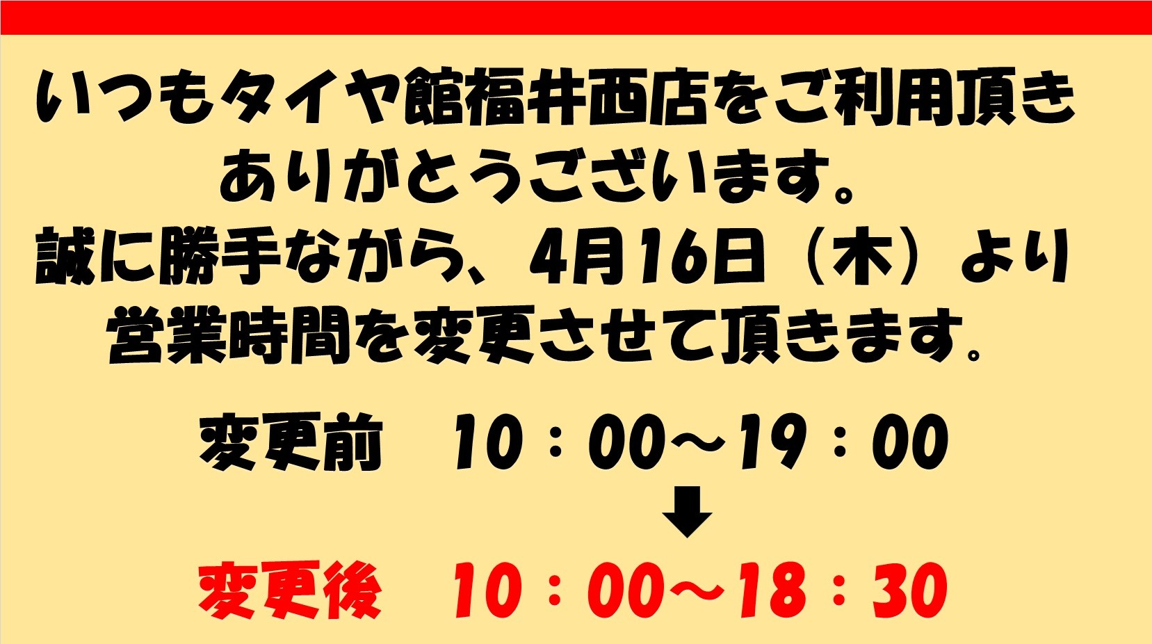 記事一覧 フィットのバッテリー交換 ・【ホンダ】 ・【フィット】 ・バッテリー交換 バッテリーメーカー:【パナソニック】 バッテリー種類:【サークラ】 適合:【N-65】 夏の突入前に、しっかりとバッテリーチェックをしましょう(#^.^#) 夏は、エアコンなどでバッテリーを頻繁に使うことになりますので、夏になる前に点検を!! ... 2026年4月14日 ポスト 16日より!営業時間変更のお知らせ 予告通り、16日から営業時間が変更になりますので、改めてお知らせです!! 2026年4月14日 ポスト