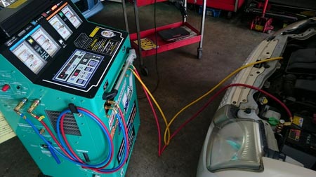 するとチェンジャーが作動してエアコンガスを回収して3種類のフィルターで綺麗にして保存し、エアコン内の真空引きして先ほど綺麗にしたガスを戻して足りないガス量を新たに補充してエアコンコンプレッサーオイルも充填してくれます!!( ̄- ̄)ゞ