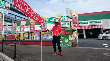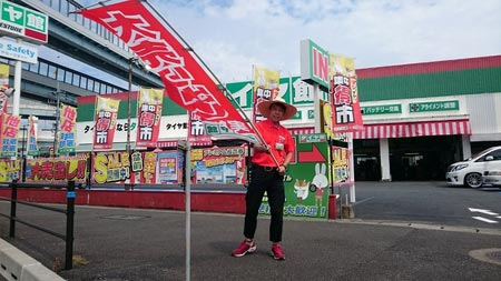 暑い中お疲れ様です!お店のアピールの為に一生懸命愛情込めて旗を降っております(⌒0⌒)/~~