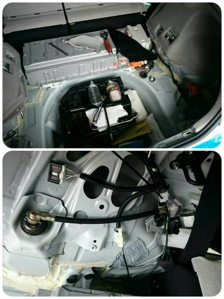 フロント周りをバラして、モーターの配線を車内に引き込んで、リアもトランクの内張りをバラして配線をフロントのグローブボックスまで引き回してEDFCのコントローラーと繋ぎます。(^-^)/