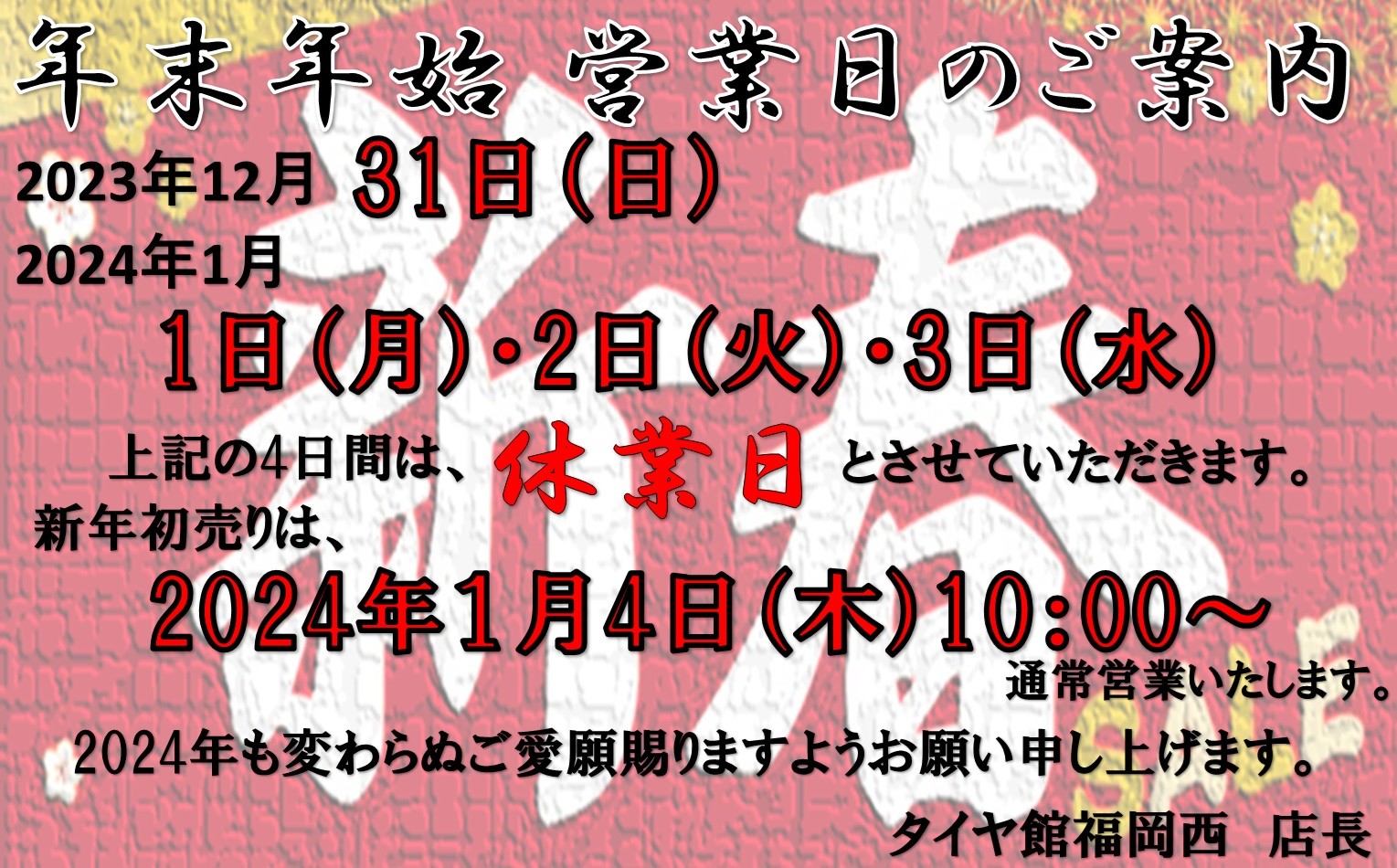 2023年12月31日(日)~2024年1月3日(水)まで休業日。
