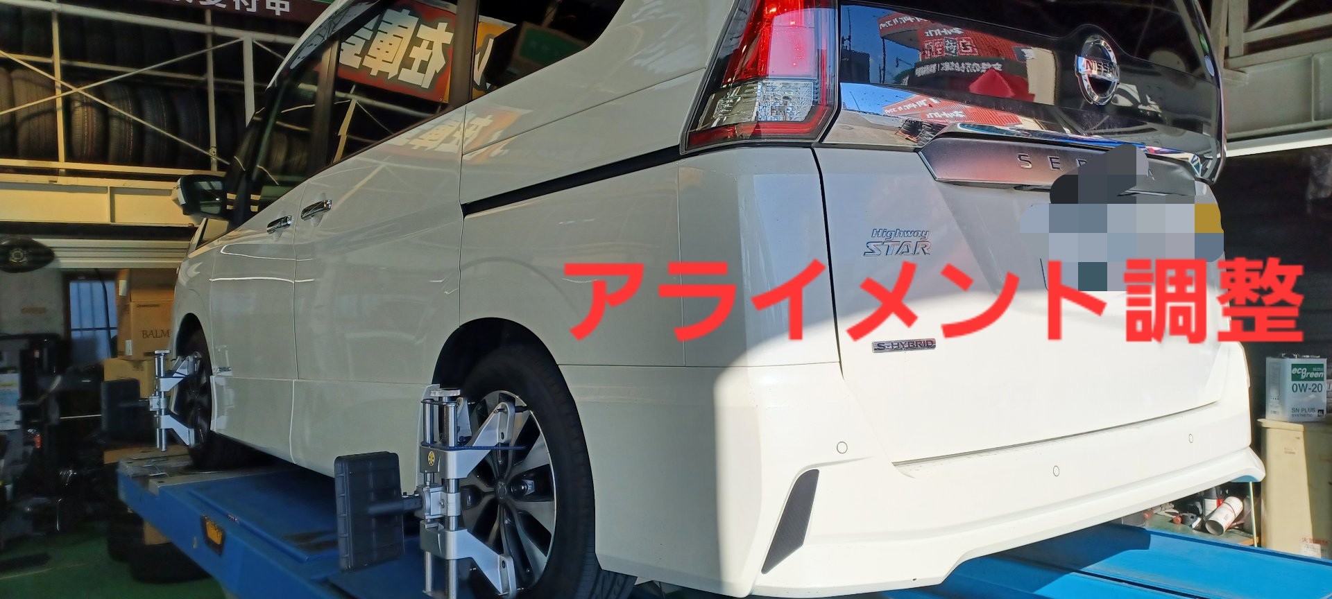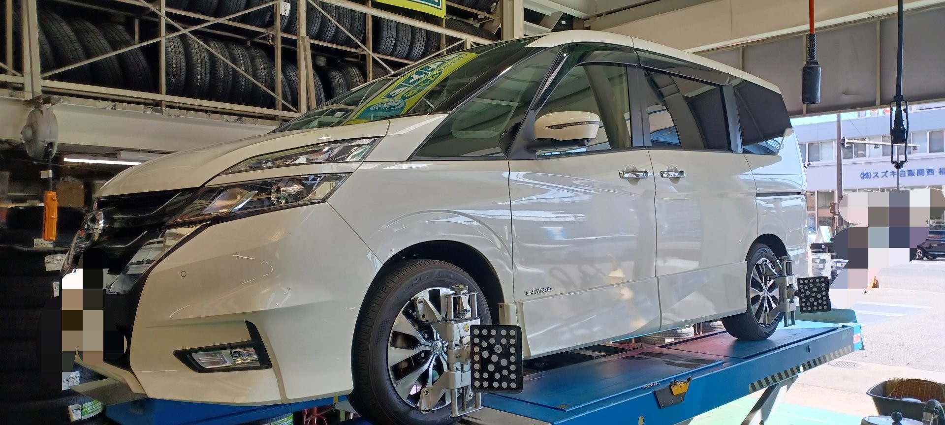 NISSAN セレナ 車検 ショックアブソーバー交換 アライメント調整。