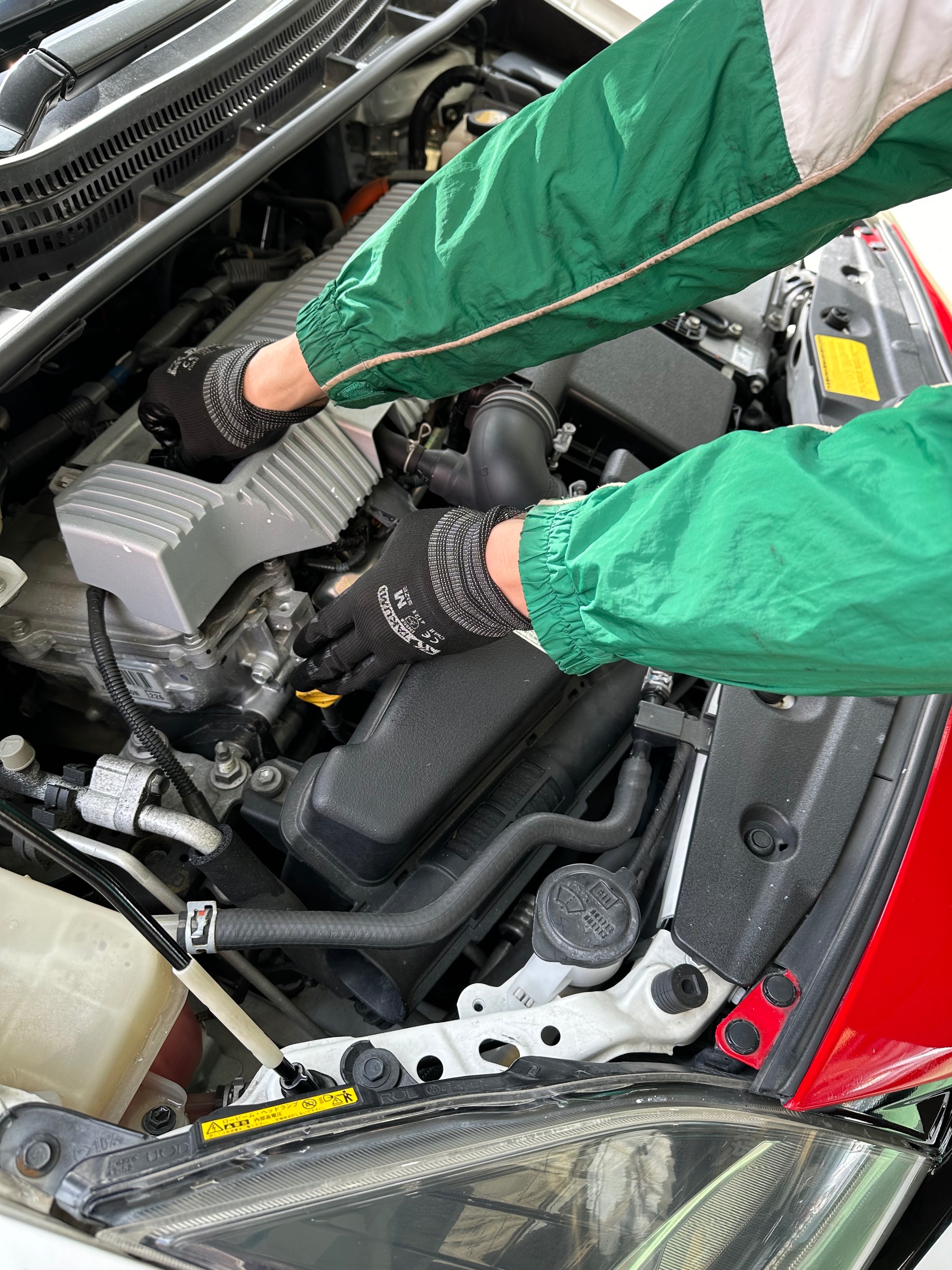 最後に、オイルの交換後はお客様と一緒にオイルフィラーキャップおよびオイルレベルゲージの締まりの確認とオイル量の確認をしております。