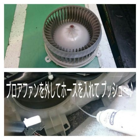 車によって施工の仕方は違いますが、30プリウスは車内のブロアファンを外してホースを入れて直接エバポレーターに噴射します(^-^)/