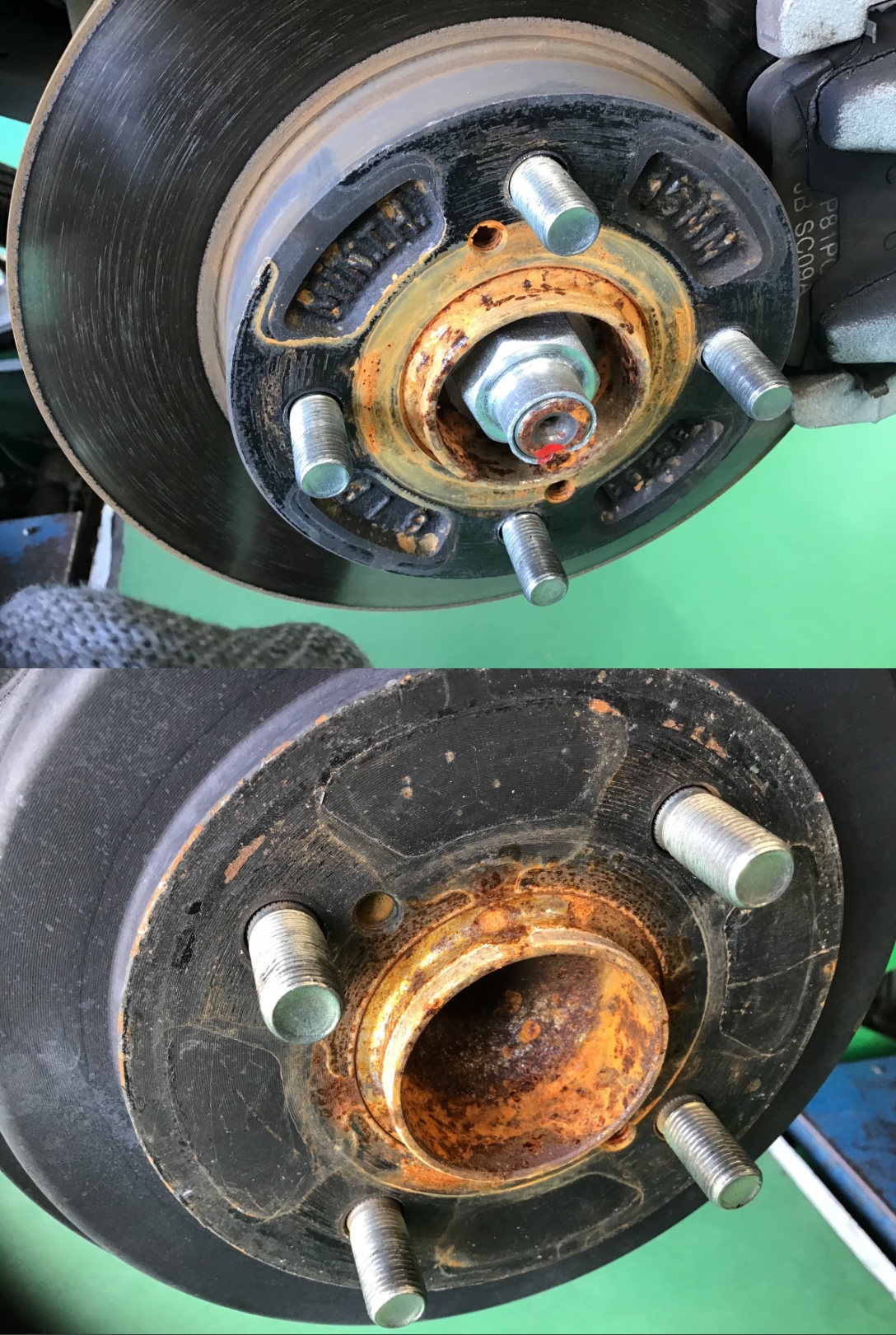鉄でできているため、雨などの水分やブレーキからの熱の影響を受け非常に錆びやすい場所なんです。
