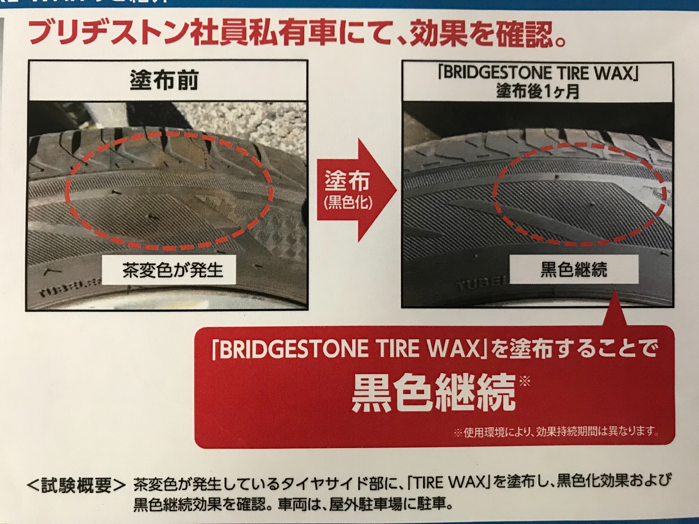 しかし、ブリヂストンのタイヤWAXを塗布することで、タイヤの表面がコーティングされ、黒色化するんです! ↓こちらが試験結果です。