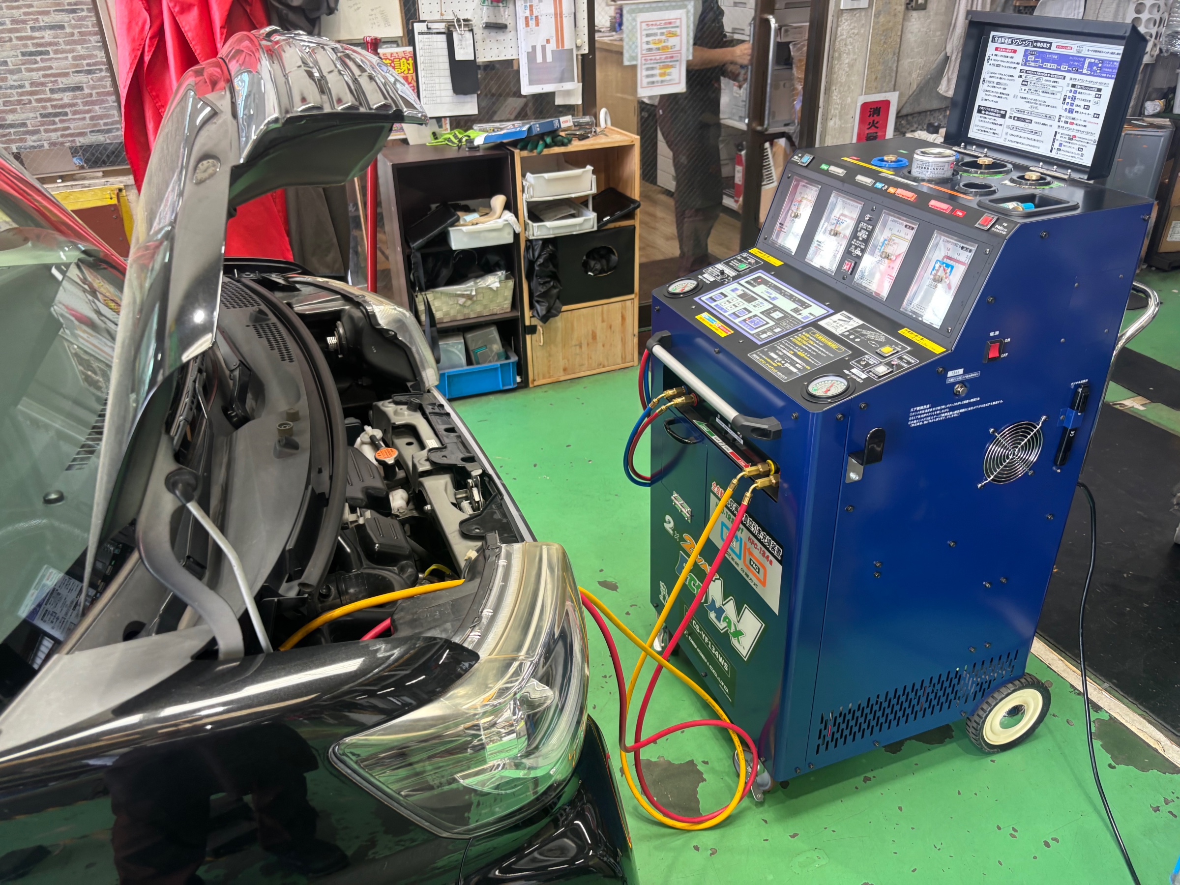専用の機械を使用し、冷媒ガスを真空引きですべて