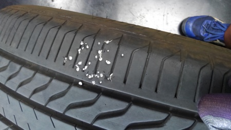 タイヤ接地面に何かがたくさん刺さってます。