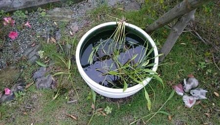 散らかった水草を取っていると鉢に黒色の出目金魚だけ