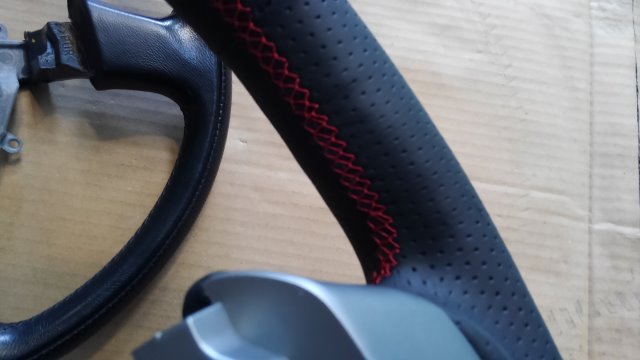 上の純正より、下のダムドさんのステアリングのほうが内装色と