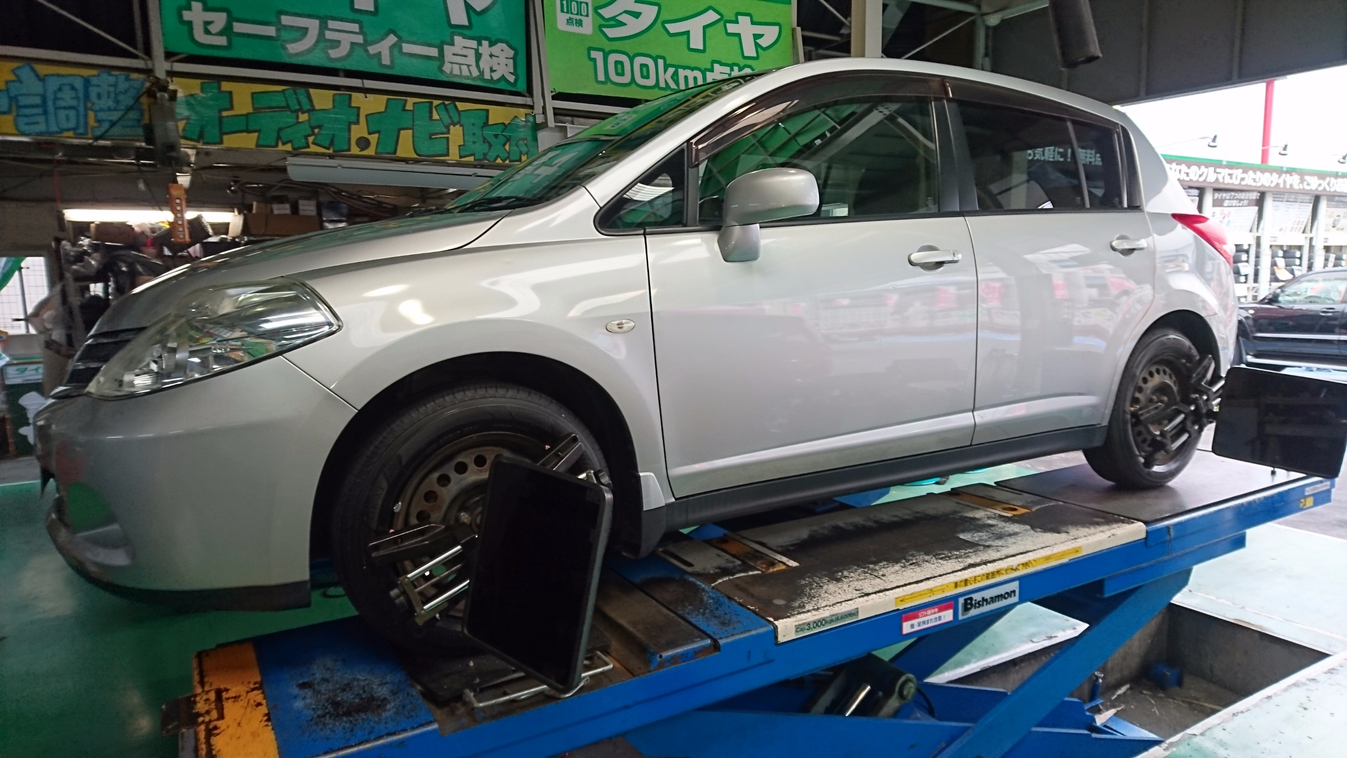 先日、タイヤ交換でご来店のお客様にタイヤ交換とセットでアライメント調整を行いました。