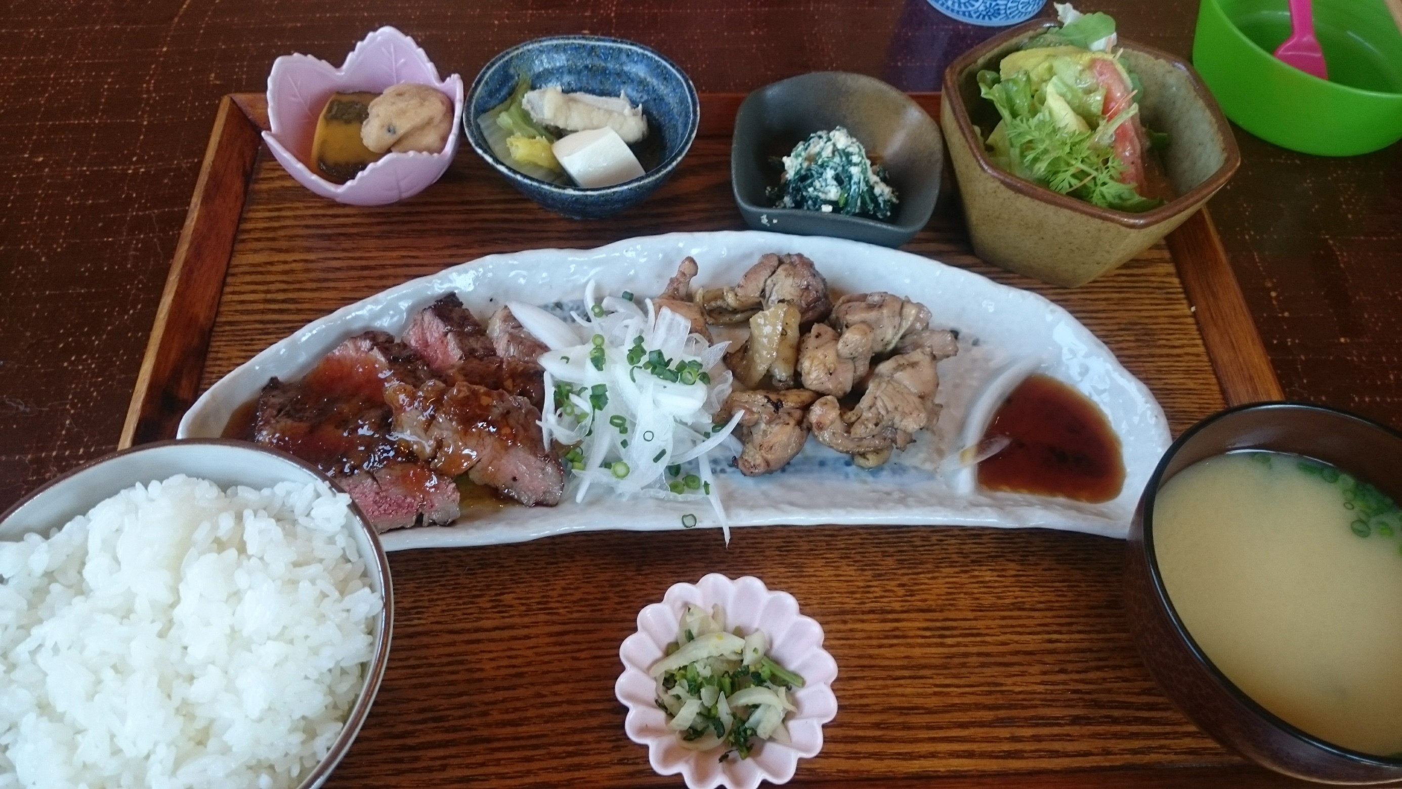 牛ロースのステーキと地鶏の炭火焼きのセットです(≧▽≦)