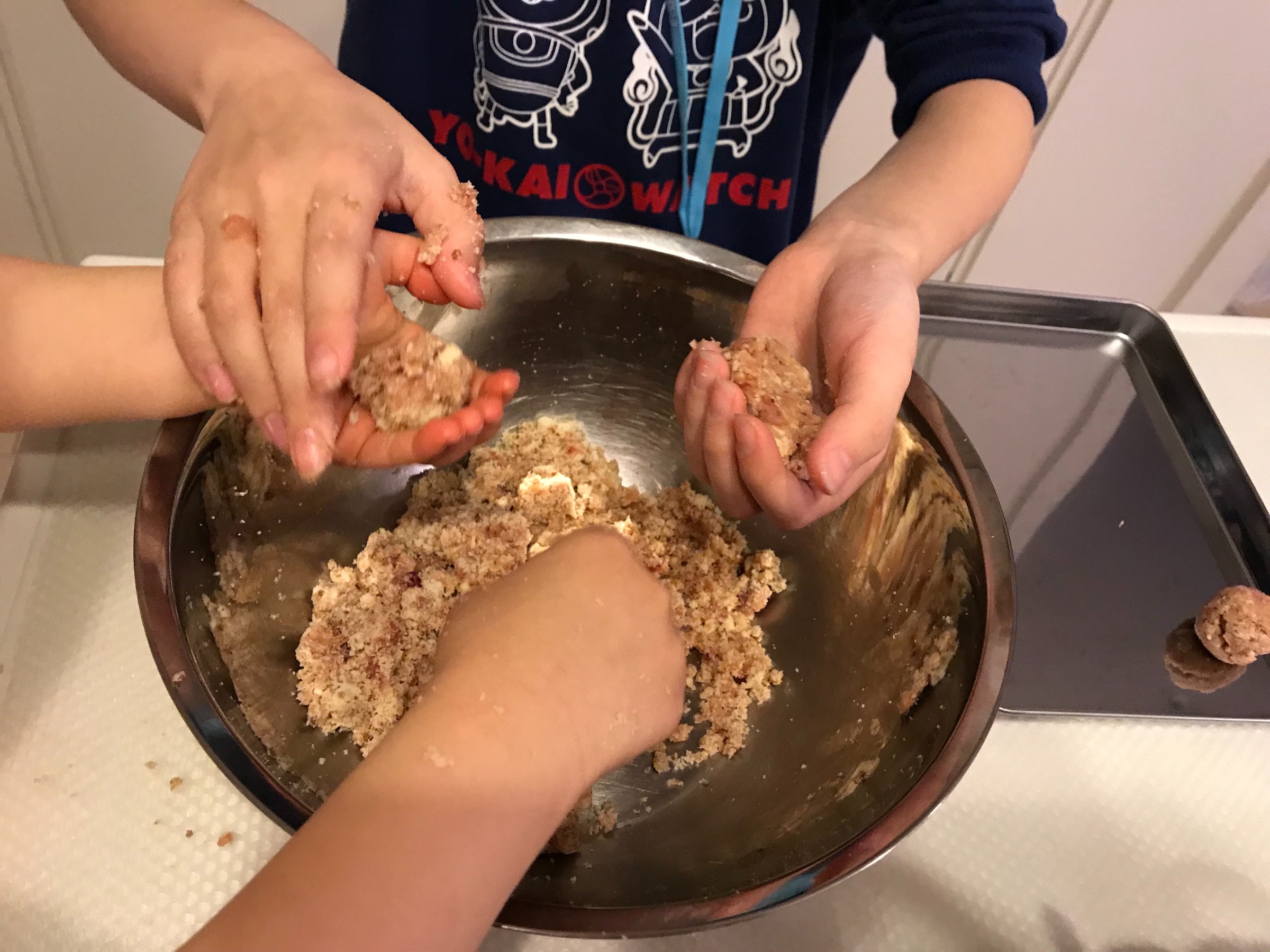 娘も、コネコネして、「お団子みたいに丸く作って!!」と言うと、上手に作っていました!!