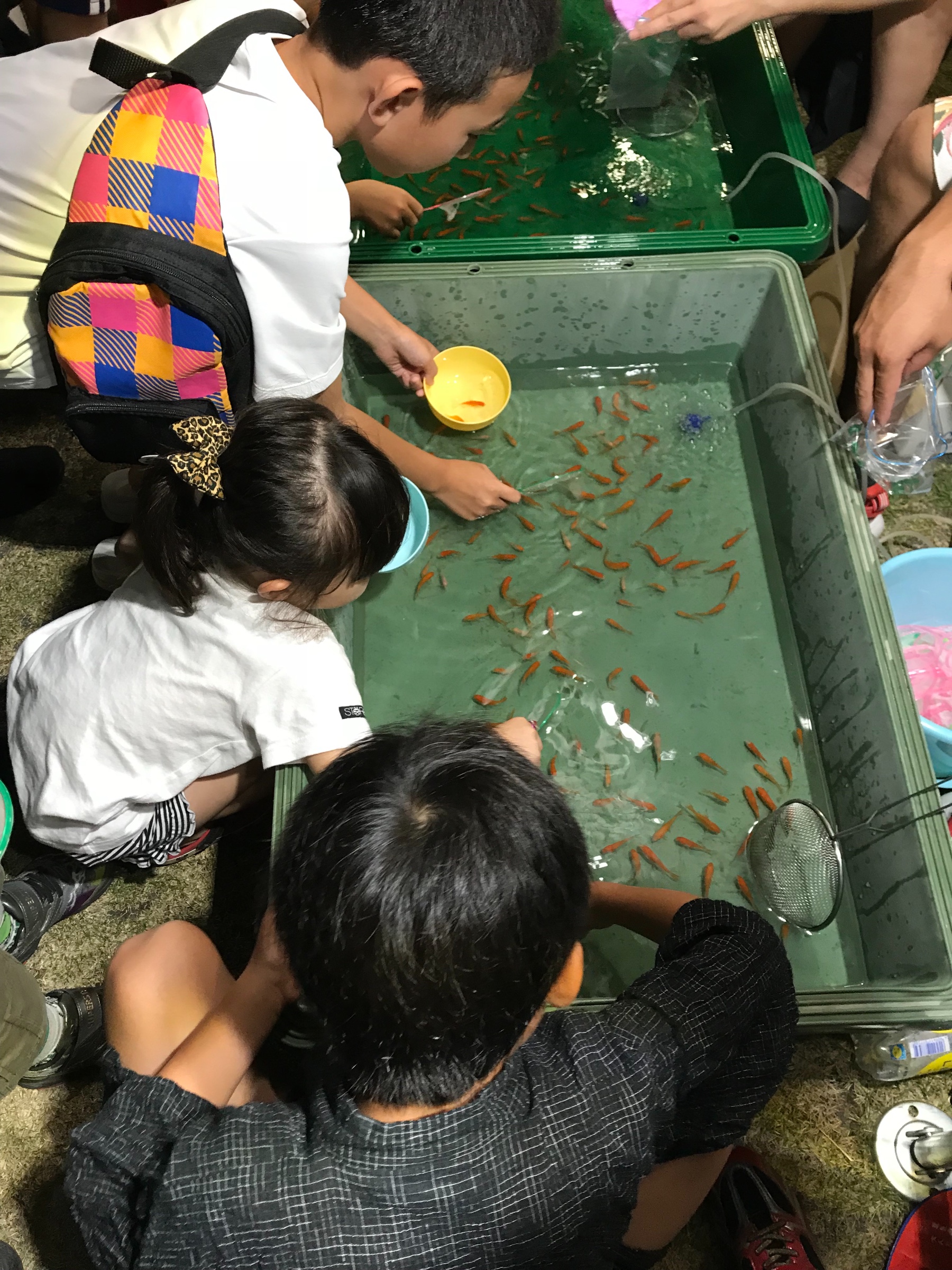 金魚すくいでは、昨年は息子はたくさん捕れたのですが・・・今年は2匹だけでした・・・が、サービスでもう一匹いただきました。