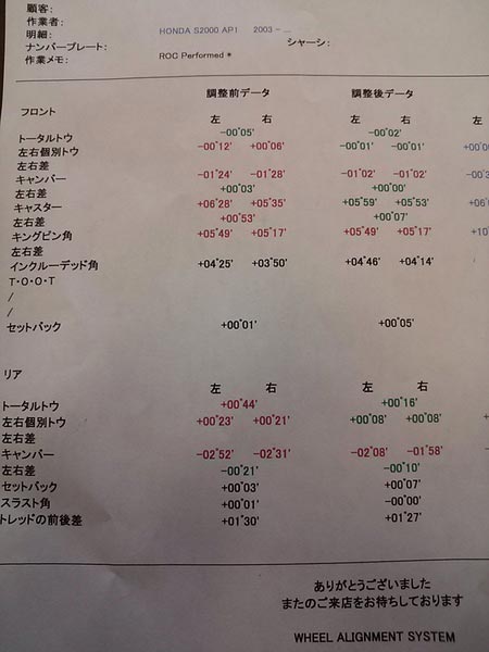 タイヤは、ポテンザS001でアライメント調整を施工する事に成りまして