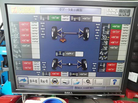 早速タイヤ交換してアライメント調整機に乗せてみると……!!(゜ロ゜ノ)ノ