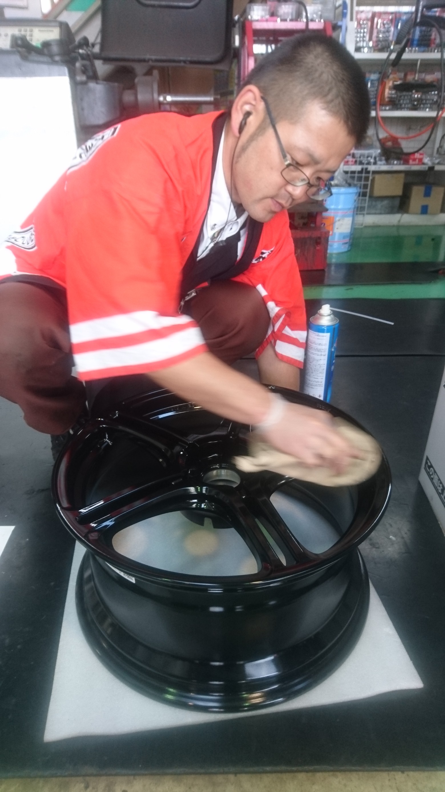 そう!ホイールのコーティングをしていたんです!日記ではお茶目な記事を書く吉村さんですが、作業では真剣な表情でされておりました~!