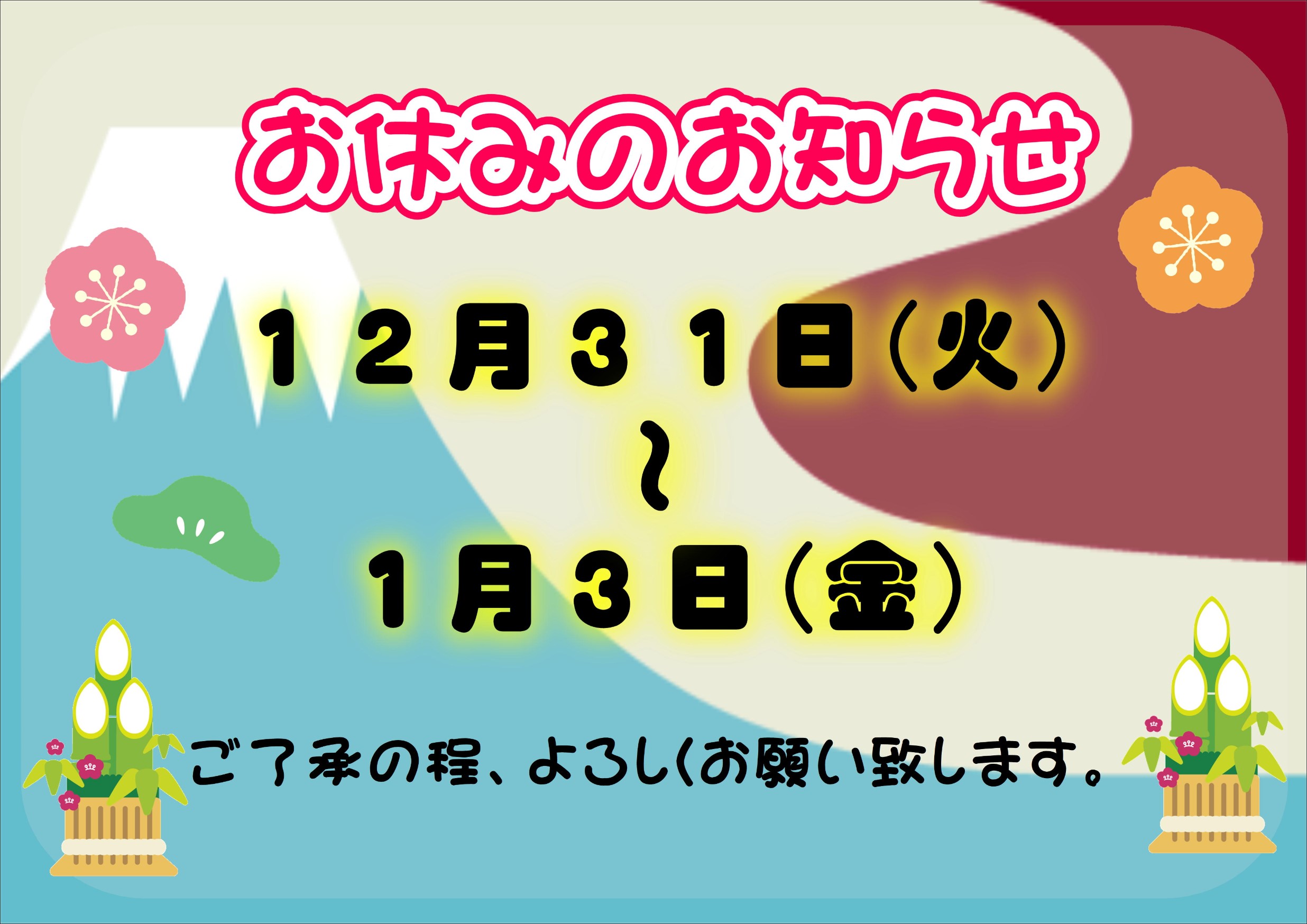 〜年末年始のお休み~ ポスト 2019年12月7日 こんにちは! 福岡市 西区 福重 の 交差点 にある タイヤショップ タイヤ館 福岡西 です! 年末年始のお休みのお知らせです! 12月31日(火)、1月1日(水)、1月2日(木)、1月3日(金) お休みいただきますm(_ _)m ご迷惑をおかけしますが、 ご了承お願いいたします。 1月4日(土)からは 元気に営業いたしますので、 お待ちしております!!! カテゴリ:お知らせ