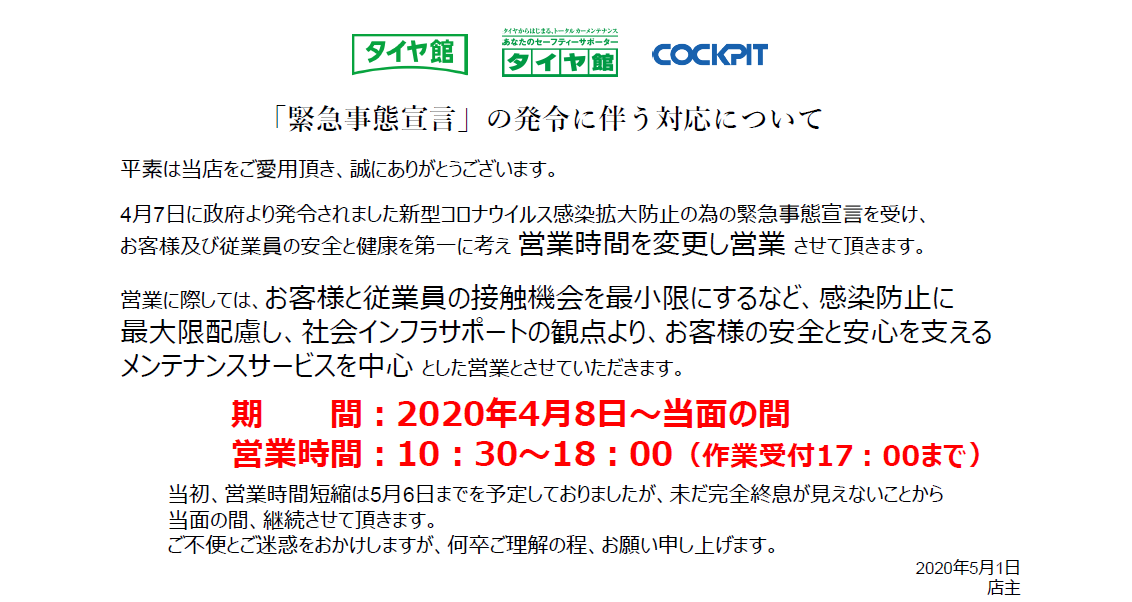お客様及び従業員の安全と健康を第一に考え 営業時間を変更し営業 させて頂きます。