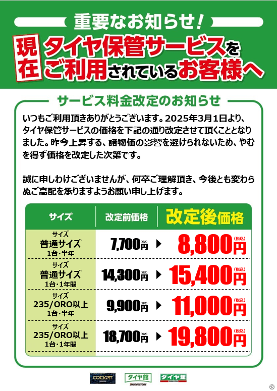 タイヤ保管サービス料金改定のお知らせ【2025年3月1日より値上げになります】