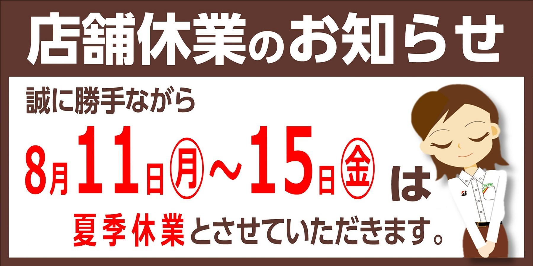 8/11(月)~8/15(金)の5日間ですが、夏季休業となります。 ご迷惑をお掛け致しますが、何卒よろしくお願い致します。 816(土)は、通常営業となります。 夏季休業中は、WEBからのタイヤ購入をご利用下さい。 https://tire-onlinestore.bridgestone.co.jp/home/?_gl=1*q103q7*_gcl_au*MzE...
