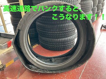 高速道路でパンクすると、こうなります!! 朝1番で高速道路でパンクしたお車のタイヤ交換をしました。 原因は、わかりませんが、サイド部分が剥離しているので、 空気圧不足が懸念されます! タイヤにとって空気圧は、とても大切なので、一ヶ月に一度は点検致しましょう!!