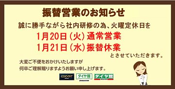 誠に勝手ながら社員研修の為、通常は火曜日が定休日となりますが、 1/20(火) 通常営業 1/21(水) 振替休業 とさせて頂きます。 大変ご不便をお掛け致しますが、何卒ご理解賜ります様お願い申し上げます。