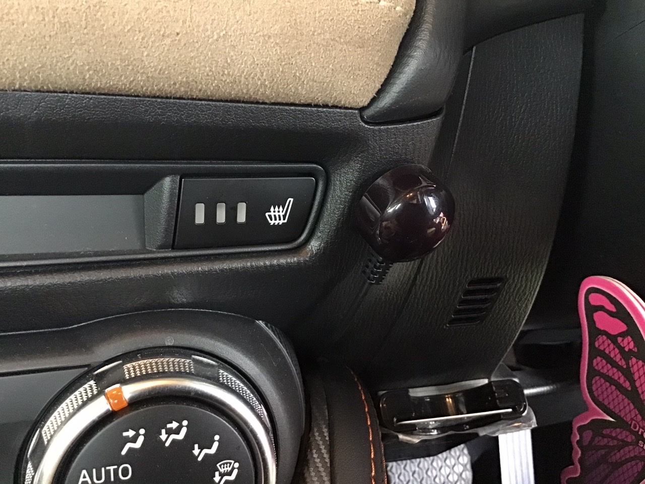 サイドブレーキの下に隙間があったのでそこに綺麗に収納出来ました。
