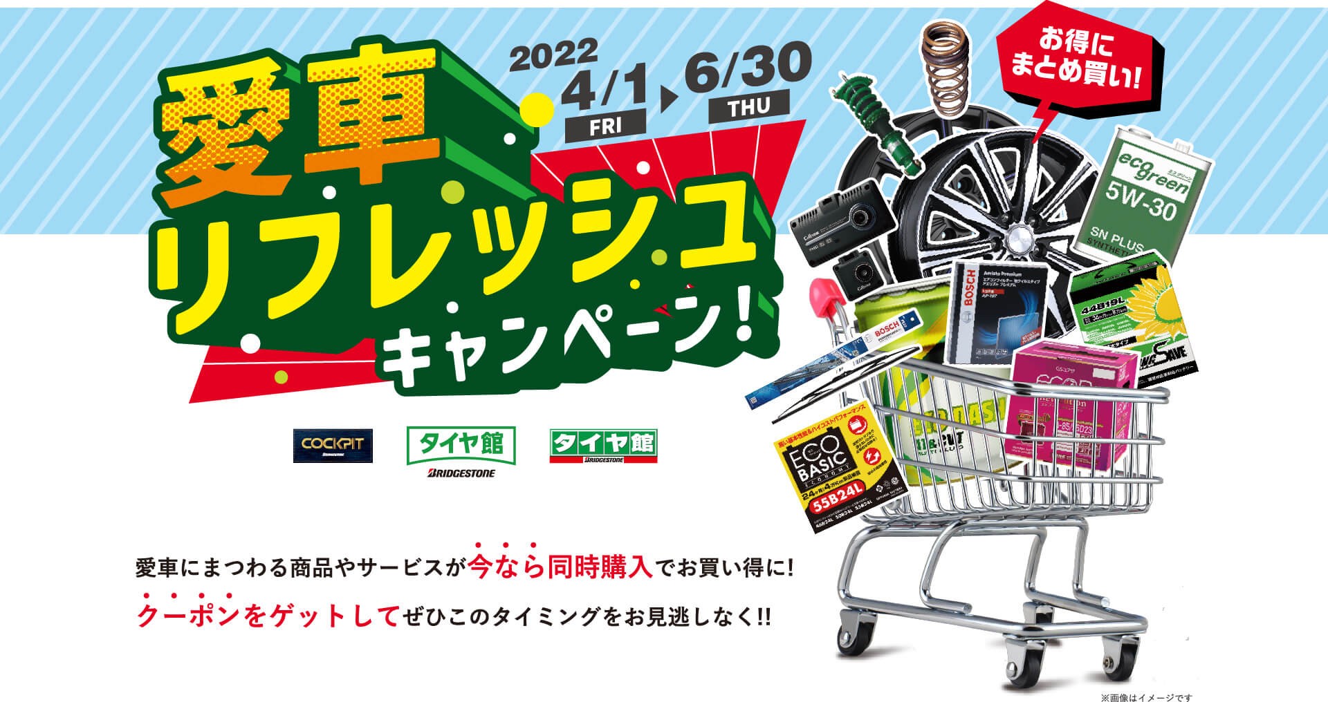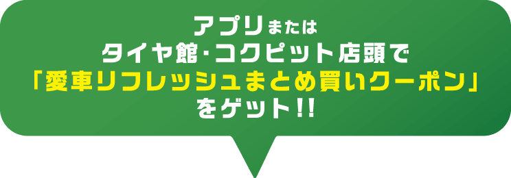 アプリまたはタイヤ館・コクピット店頭で「愛車リフレッシュまとめ買いクーポン」をゲット!!