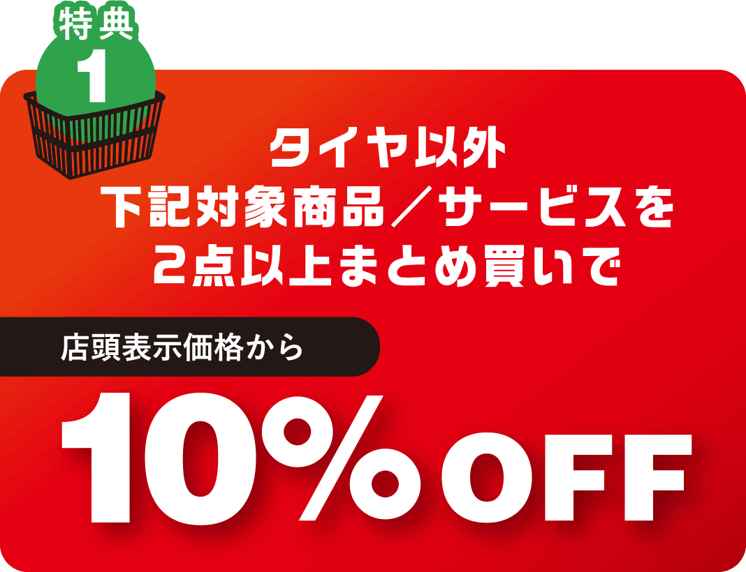※すべて、店頭表示価格から割引、一部セール品等除く ※タイヤ、タイヤ関連工賃(アライメント含)、パック商品は除く