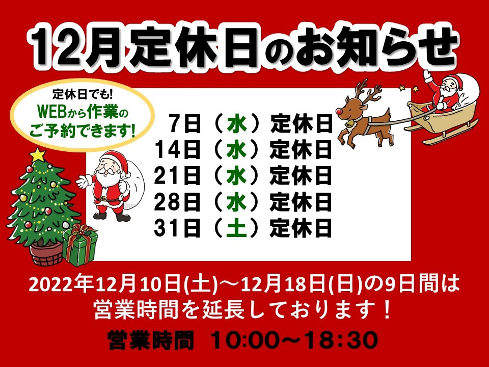 【定休日のお知らせ】12月10日(土)~の9日間営業時間延長します!!