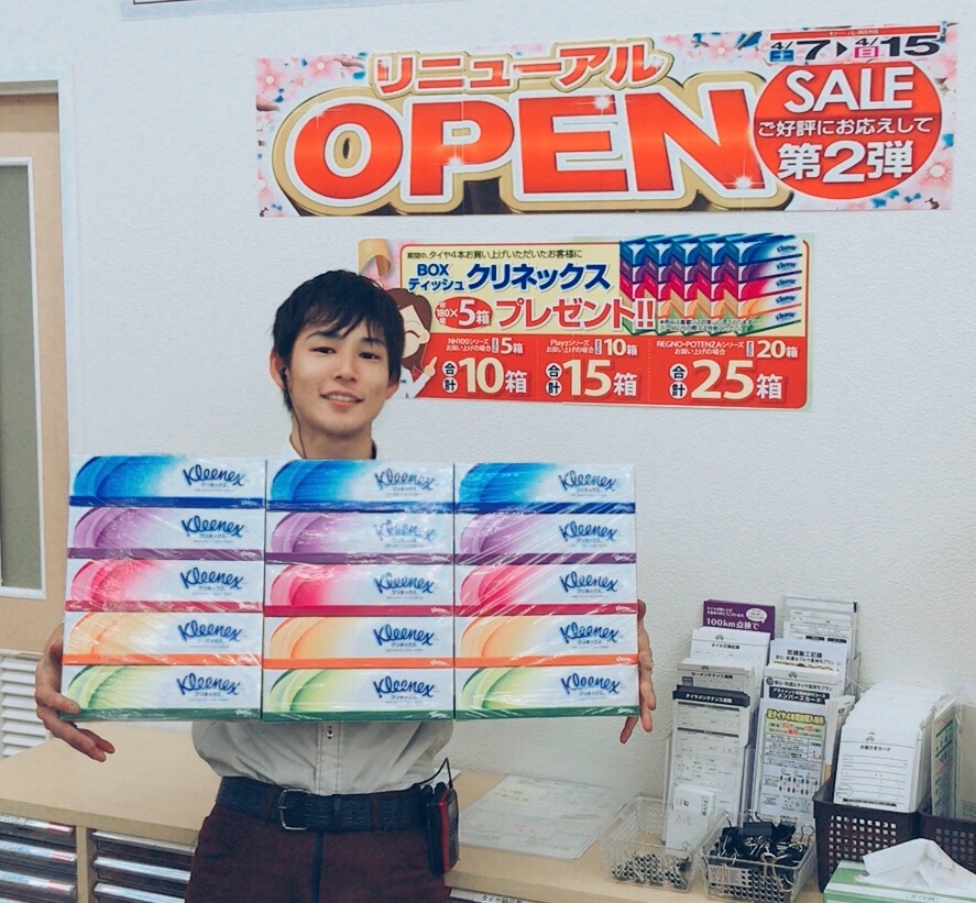 タイヤ4本ご購入で、クリネックスのBOXティッシュを最大25箱プレゼント!(´ω`)