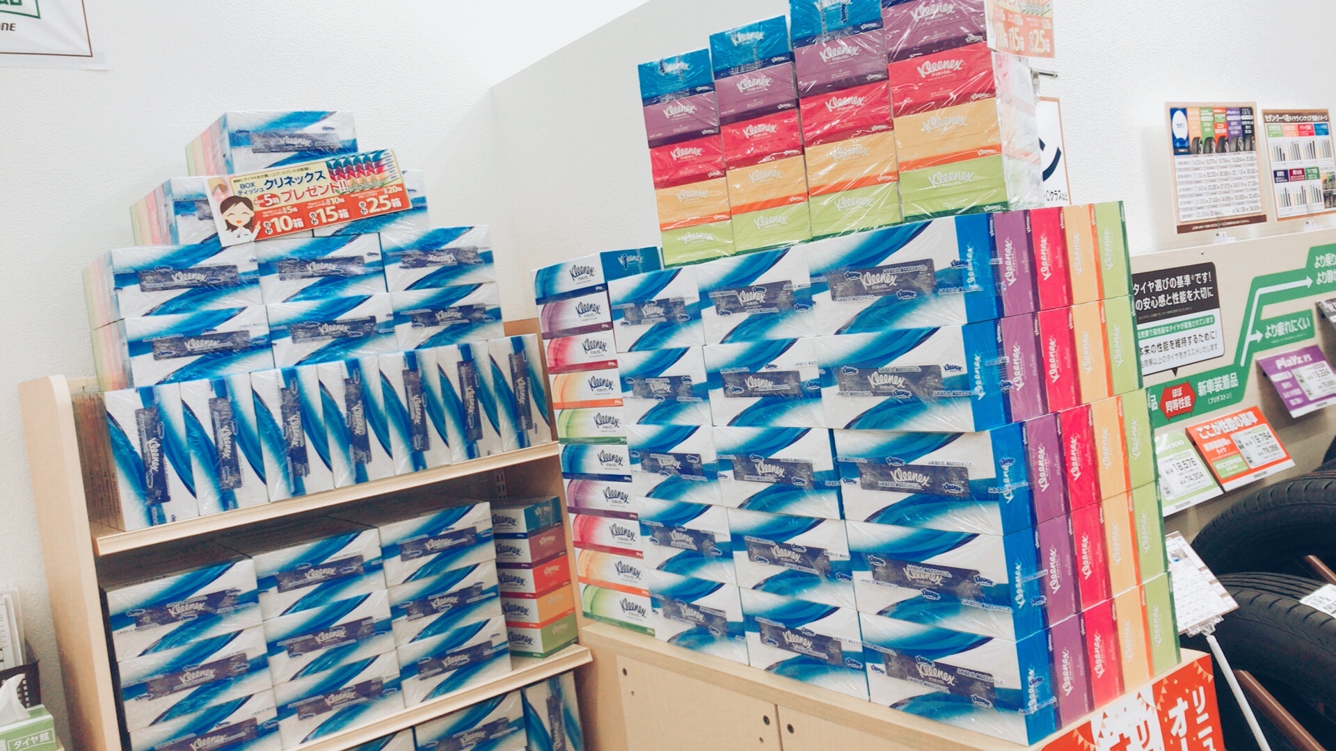 オープンセールは終わりましたが、タイヤ4本ご購入していただいたお客様にはクリネックスのボックスティッシュをお渡ししております!