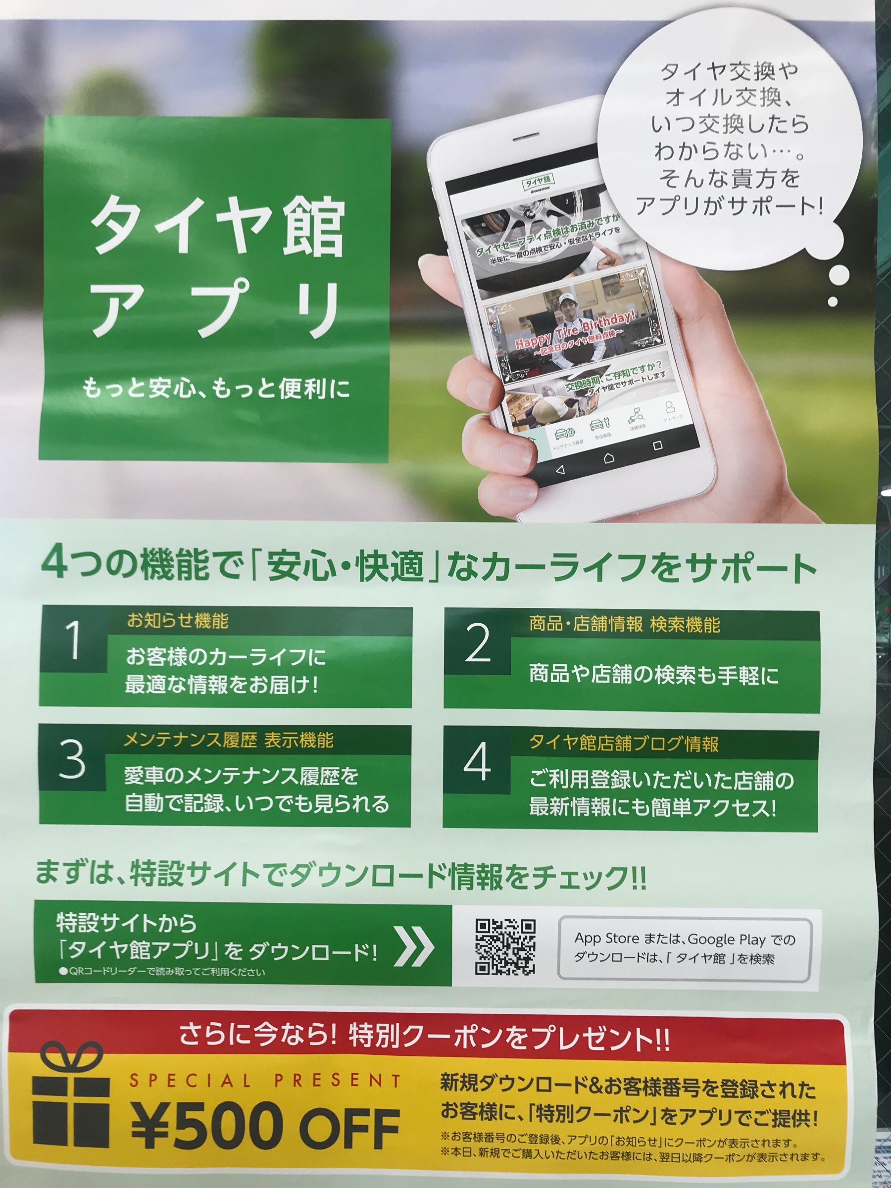 ☆タイヤ館アプリ配信中☆ ポスト 2018年9月10日 皆さんこんにちは ヤマダです♪ タイトル通り「タイヤ館アプリ」無料配信中です いつオイル交換した? 次の空気圧点検っていつだっけ? そんな貴方をサポートしてくれるタイヤ館アプリ! アプリを開けばひと目でわかるので便利ですよ! 新規ダウンロード&お客様番号を登録されたお客様には「特別クーポン」を配信しております! 詳しくは店頭スタッフまでお気軽にお声がけくださいませ♪ 担当:ヤマダ