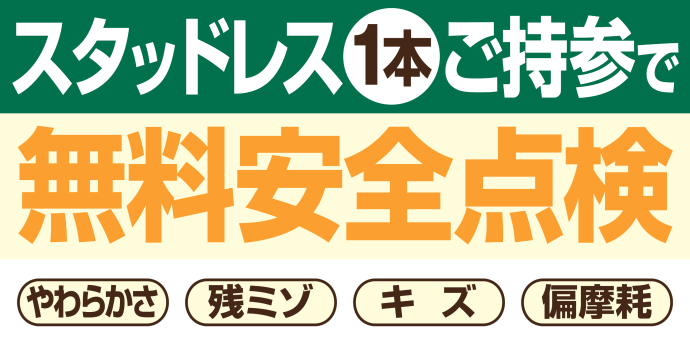 スタッドレスタイヤ無料点検します! ポスト 2018年11月10日 みなさんこんにちは! ヤマダです(^^) 当店では冬タイヤへの脱着が始まっております! 繁忙期に入ると沢山のお客様がご来店されますので、脱着や交換を考えておられる方はお早めのご予約をオススメします! また!スタッドレスタイヤ一本ご持参していただければ 当店スタッフが今シーズン使えるかチェックをさせていただいております! 点検は無料で行なっております! スタッドレスタイヤのことなら当店まで! 担当:ヤマダ