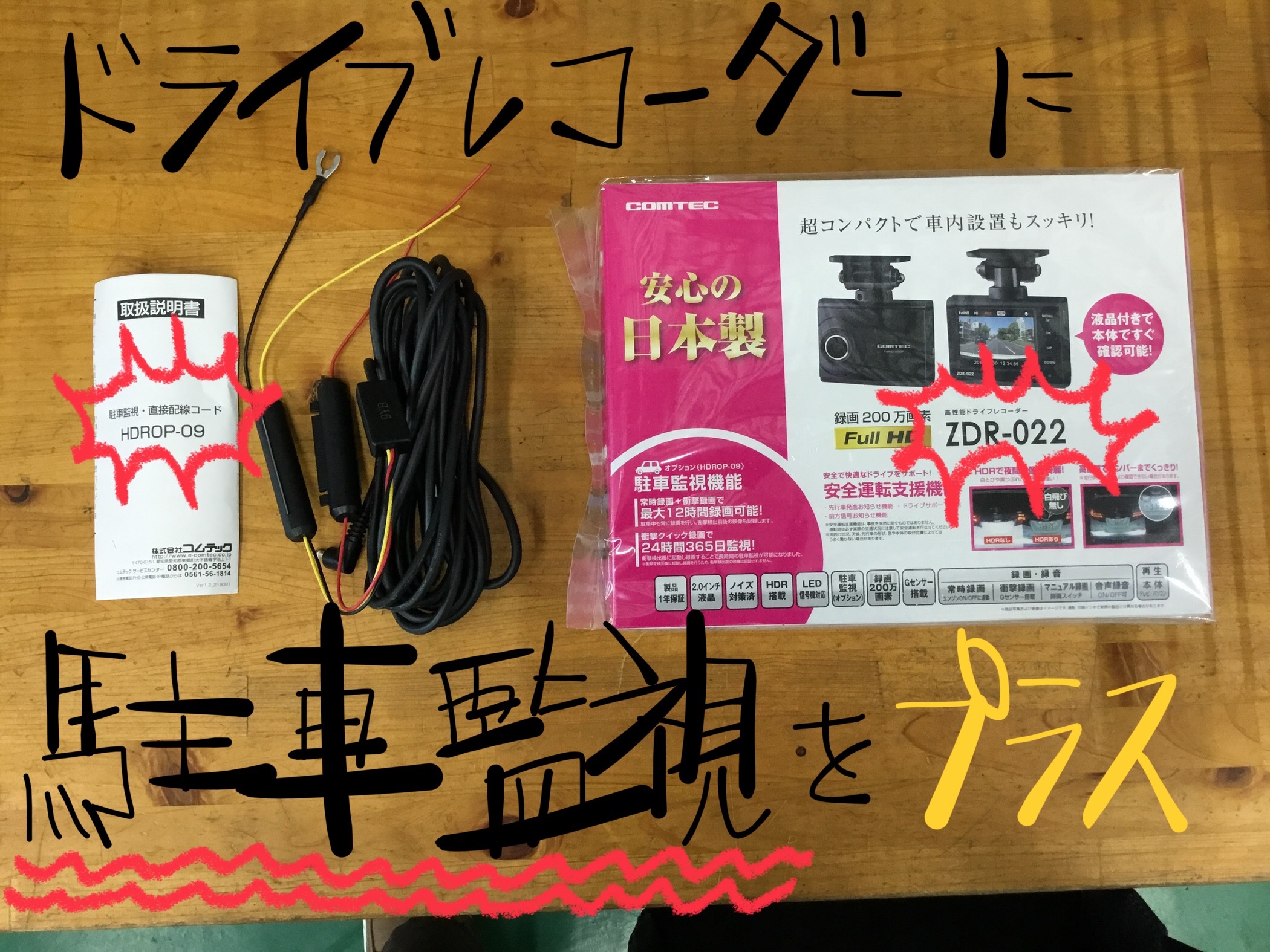 今回の取り付けは、コムテックZDR-022になりました。