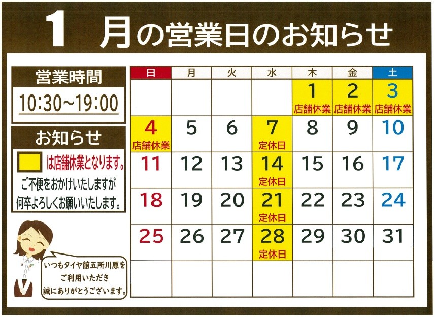 1月の営業時間と定休日に関するお知らせ 2025年12月28日 こんにちは(^▽^)/ タイヤ館五所川原のWEBをご覧いただき ありがとうございます。 1月の定休日のお知らせです。 1日・2日・3日・4日店舗休業となっております。 7日・14日・21日・28日が定休日となっております。 お間違えの無いようお願い申し上げます。 ご不便ご迷惑をおかけしますが ご理解のほどよろしくお願いいたします。 皆様のご来店心よりお待ちしております。