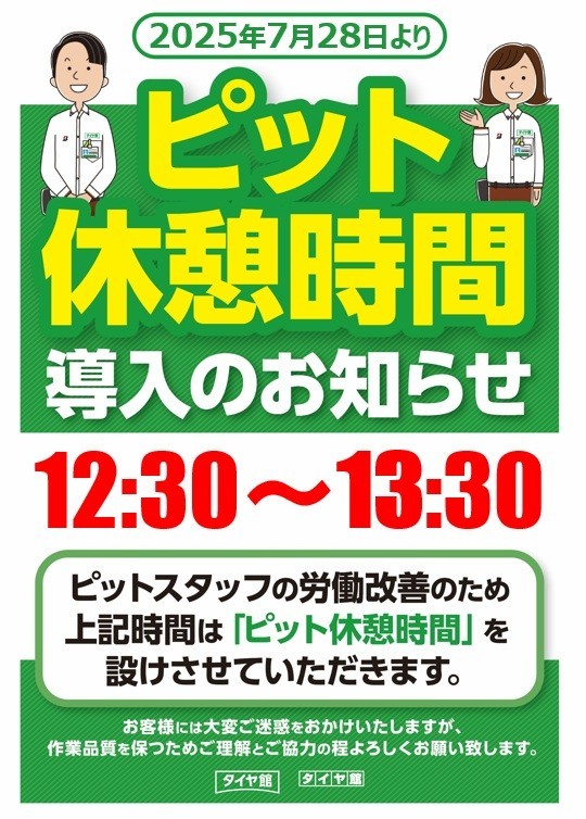 ピット休憩時間のお知らせ。 2025年12月27日 タイヤ館五所川原のWEBをご覧いただき ありがとうございます。 7月28日(月)より 【12:30~13:30】の間 ピット休憩時間を設けさせていただきます。 ご不便ご迷惑をおかけしますが ご理解のほどよろしくお願いいたします。 皆様のご来店心よりお待ちしております。