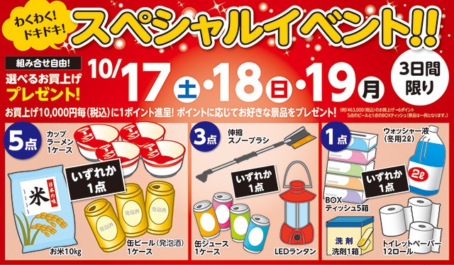 気になるお買上プレゼントはお米・発泡酒・カップ麺・ジュース類・日用品など