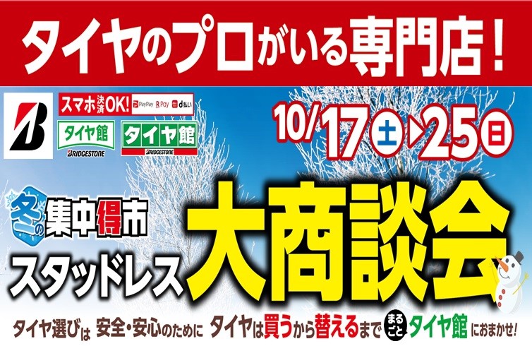 スタッドレス大商談会スタート! ポスト 2020年10月16日 10月17日より毎年恒例のスタッドレス大商談会がスタートします! 今シーズン、スタッドレスタイヤご購入をご検討中の方は是非足を運んでみて下さい! 店頭、店内にお買得品満載でご用意いたしました。 17日から19日までの3日間限定でスペシャルイベントも開催しております。 詳しくは新聞折込またはWEBチラシでご確認下さい! 是非この機会をお見逃しなくお気軽にご来店下さい! カテゴリ:お知らせ