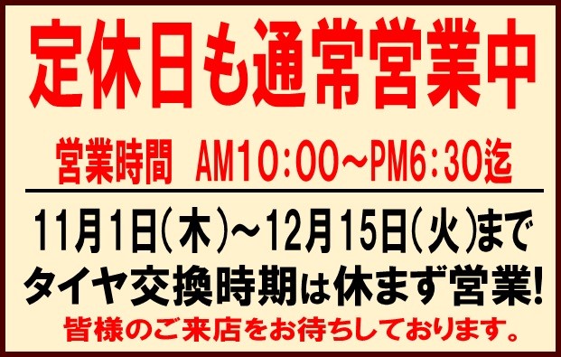 水曜定休日も休まず営業! ポスト 2020年11月3日 いつも当店のWEBをご覧頂きありがとうございます。 スタッドレスタイヤへの交換シーズンと言う事で、水曜定休日も休まず営業! ウインターセールも大好評!11月8日まで開催中! 今シーズン、スタッドレスタイヤをご購入ご検討中の方は お見逃しなくご来店下さい! スタッドレスタイヤへの履き替えも当店におまかせ下さい!