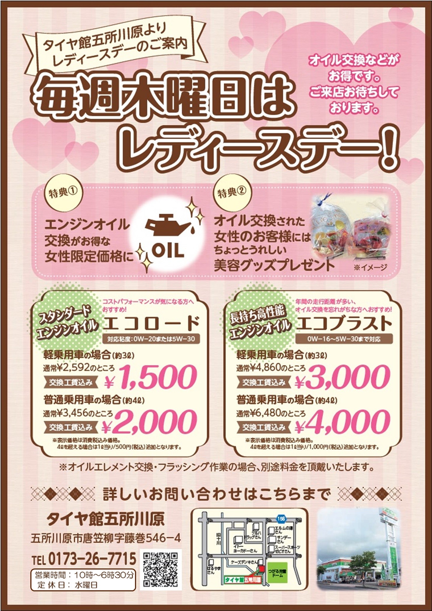本日、木曜日はお得なレディースデイ! ポスト 2021年1月7日 いつも当店のWEBをご覧頂きありがとうございます! 本日は、女性ドライバーの方に大好評のレディースデイ! オイル交換をはじめとするメンテナンスがお得に! 更に、女性の方限定で「ちょっとうれしいプレゼント」や ヘッドライトコーティング、ウィンドーウォッシャー満タン補充など 無料でサービスしております。 初めての方も大歓迎!お気軽にご来店下さい! 電話予約も受付しております。