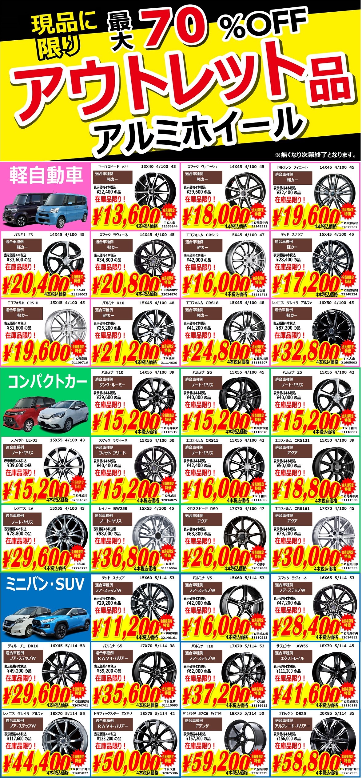 【リスト更新】アウトレットアルミホイール【早いもの勝ち】 ポスト 2021年5月20日 ご好評につき売り切れ続出中!(^^♪ アウトレット品の在庫状況を更新しました。 早いもの勝ちですのでお早めに☆ カテゴリ:お知らせ