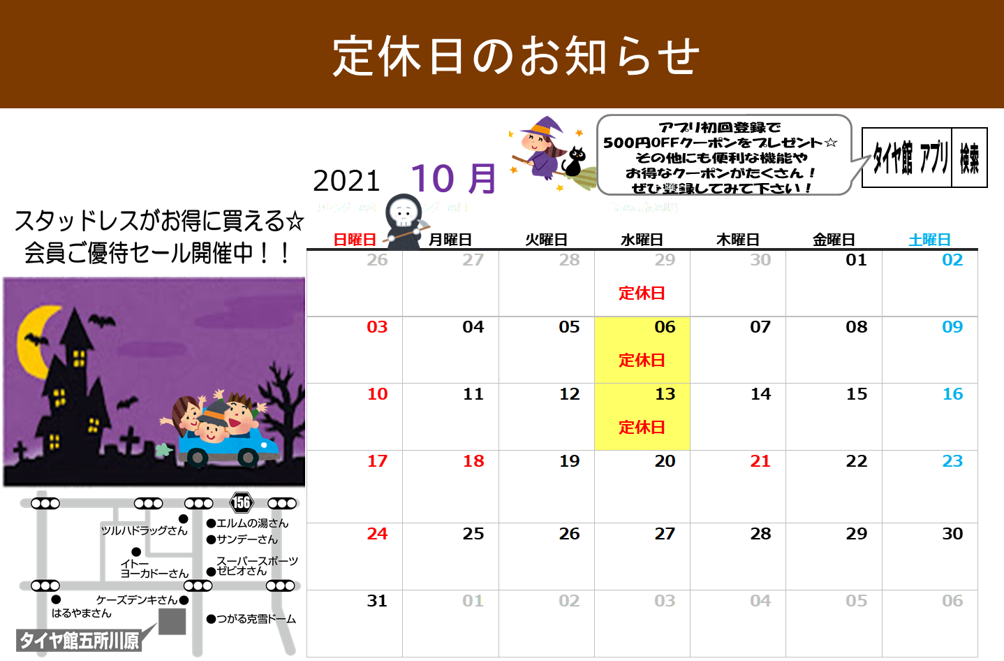 【本日水曜日は定休日です】 ポスト 2021年10月13日 いつも当店のWEBをご覧頂きありがとうございます! 本日は水曜日ですので お休みとなっております! また、明日は女性限定で オイル交換やメンテナンス用品がお得になる レディースデイとなっております! 沢山のご来店お待ちしております(^^)/
