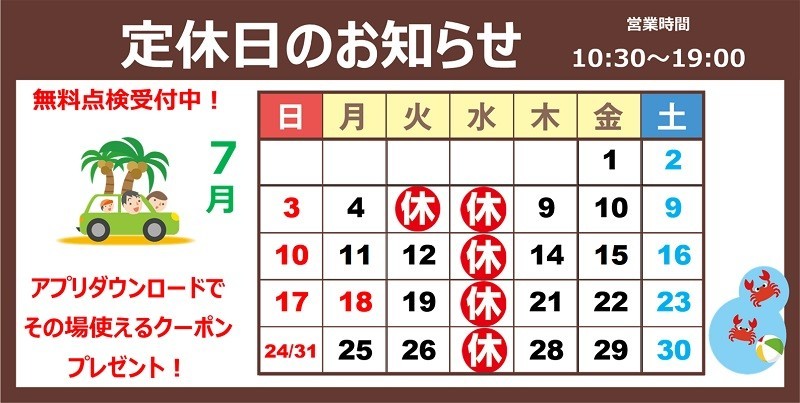 ~7月定休日のご案内~ ポスト 2022年7月1日 7月の定休日は 6日 13日 20日 27日の水曜日に加え、 5日の火曜日もお休みです。 お間違え無いよう宜しくお願い致します。 また、11日(月曜日)は 社員研修の為、17時までの営業となります。 ご迷惑をお掛け致しますが、お間違えの無いようご理解とご協力をよろしくお願い致します。 皆様のご来店を心よりお待ち申し上げます。 お電話によるお問合せ・ご予約も承っております。お気軽にご相談くださいませ。 皆様からのご相談・ご来店を心よりお待ちしております! カテゴリ:お知らせ