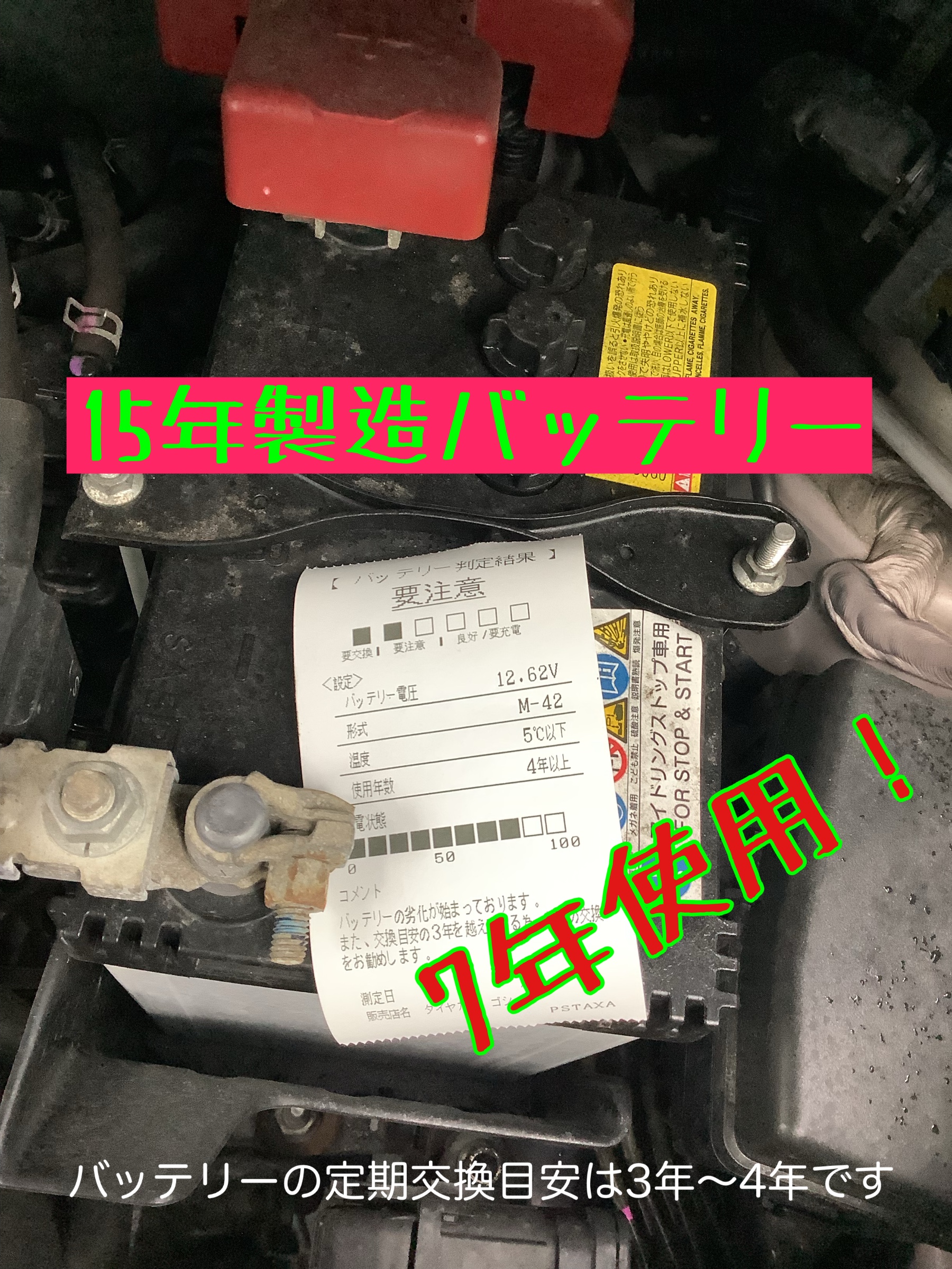 こちらは安全点検でご来店いただいたお客様のバッテリーを点検した時の写真です